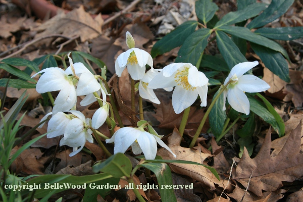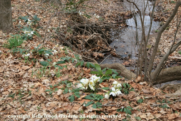 Christmas rose, Helleborus niger, present their snow white flowers. One of our heavy rainstorms must have washed these Helleborus foetidus