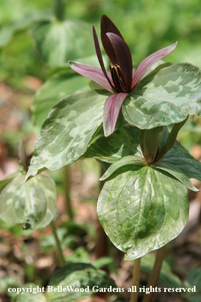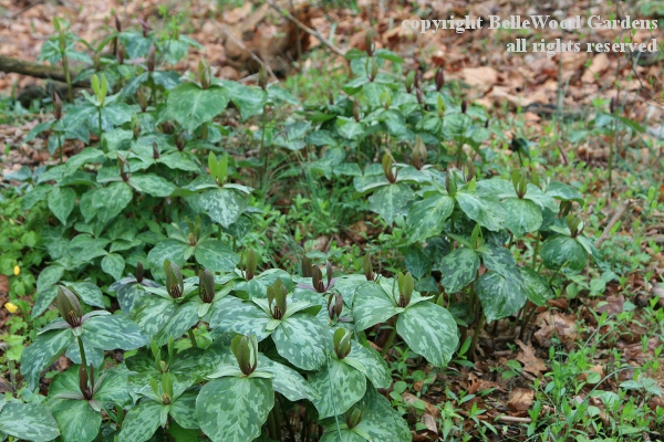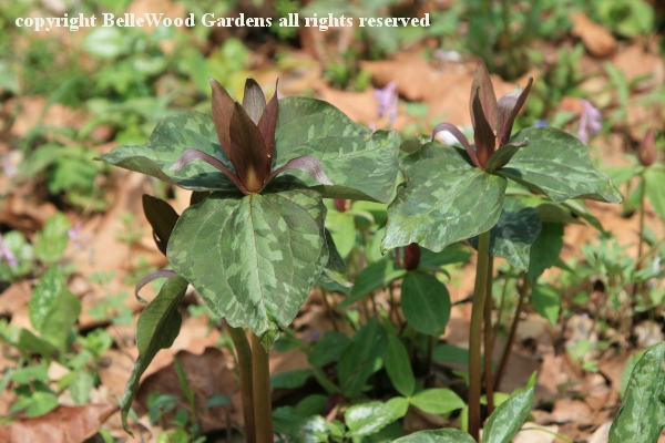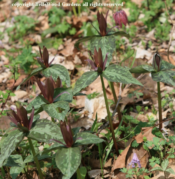 Trillium cuneatum. The flowers of sessile trilliums sit directly on the leaves. Trillium are so named for the whorl of three leaflets. "Why," my friend Ed Leimseider
