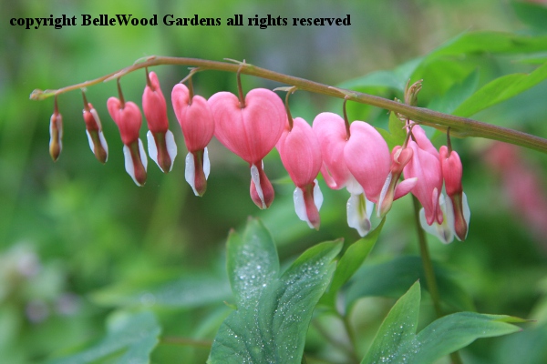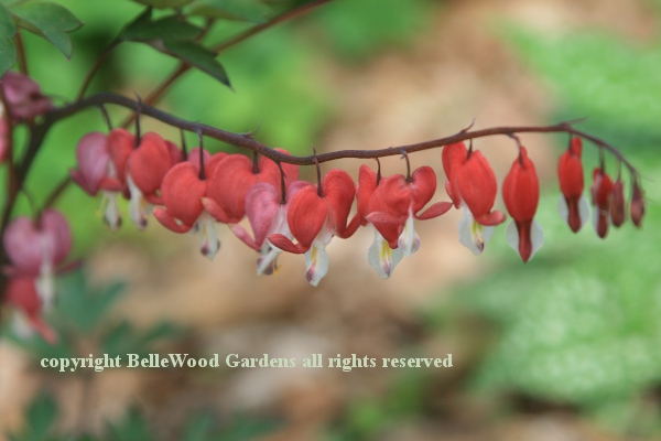 'Valentine' is a D. spectabilis cultivar with deep red flowers. Soft pink flowers scattered among the unspotted leaves of