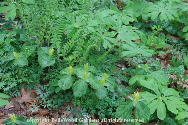Trillium luteum continues its attractive display. Bleeding heart, Dicentra spectabilis. Perchance have you read