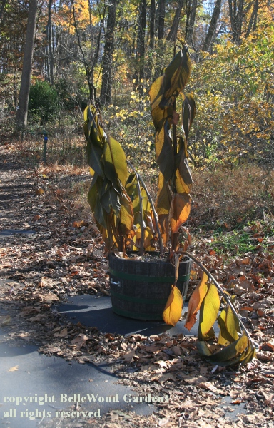 Outdoors in summer, potted, never watered in winter and kept in the basement. And then at some point the grow imperative starts up and there's nothing to do but move the pots into the greenhouse.