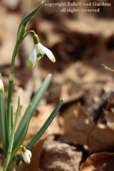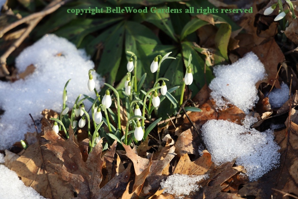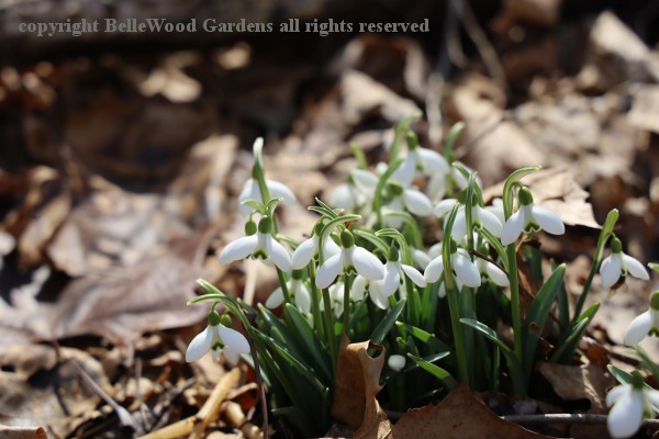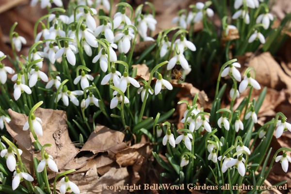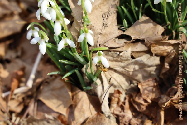 Actively growing plants are easy to move by the trowel-full when flowers fade. Golden sunshine in the form of flowers, balanced on a green Toby-ruff. Interestingly, honeybees (there's one to the right of center) prefer snowdrops as may be seen perhaps a little more clearly, here. Lots of snowdrops racing into bloom, like these Galanthus nivalis x plicatus,
