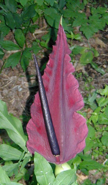 Aroids, tuberous plants in the Araceae, offer the gardener a diversity of plants. Jack-in-the-Pulpit, Arisaema triphyllum, is a native woodlander. There are a host of arisaema from abroad, many native to Japan and China, that are highly desirable. Some tender aroids are popular exotics for the summer garden - caladium, calla, and elephant ear for example. Less common are Devil's Tongue, Amorphophallus rivieri, and Voodoo Lily, Sauromatum gauttatum. And then there's Dragon Arum, Dracunculus vulgaris.