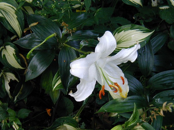 Fragrant, and flowering later in summer, 'Casa Blanca' is an Oriental hybrid lily, bred from Lilium speciosum and Lilium auratum. This group includes some of the most popular and easily grown among this Queen of (bulbous) flowers. I bought the dormant bulbs earlier this year. Lacking time to plant them then and there, I potted each one up individually. It was only after they had started into growth that I plugged them into place. And now, months later, these lovely flowers are my reward.