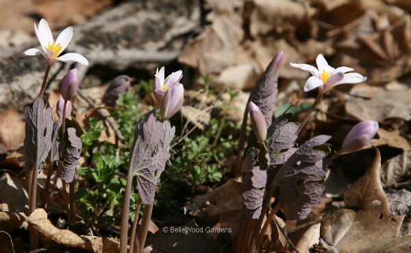bloodroot, is flushed with lavender on the back of the petals, which color also tints the leaves.