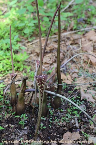 A cultivar of a native American iris, moisture loving Louisiana iris 'Black Gamecock'. A peculiar little aroid that has proven to be hardier than anticipated. This colony has developed from offsets from the original tuber. Flowers appear first, leaves afterwards. It is Sauromatum guttatum, also known as S. venosum, and Typhonium venosum. Perhaps because it will produce the strange flower sitting unplanted out on a counter it has the common name of voodoo lily.