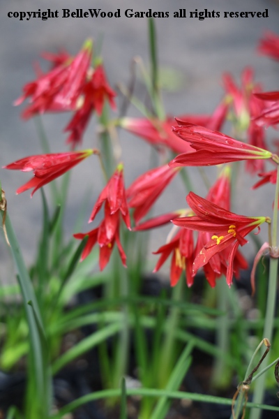 Late summer rain. I move the summer dry pots of Rhodophiala bifida out of the greenhouse.