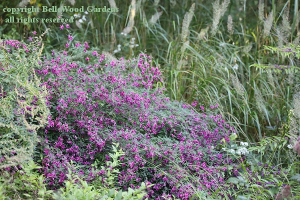 Thunberg's bush clover, Lespedeza thunbergii, is welcome for its end of summer flowers.
