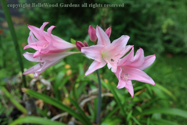 naked lady, because it flowers naked, no leaves. Latin name is Lycoris ×squamigera.