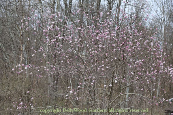 The pink star magnolia, Magnolia stellata 'Rosea' has hurried into bloom, encouraged by temperatures