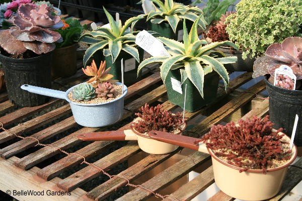 There are literal pots of succulents in funny old enamelled tinware. Don't worry -