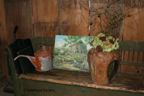 watering can and open-sided clay urn of branches & dried flowers.