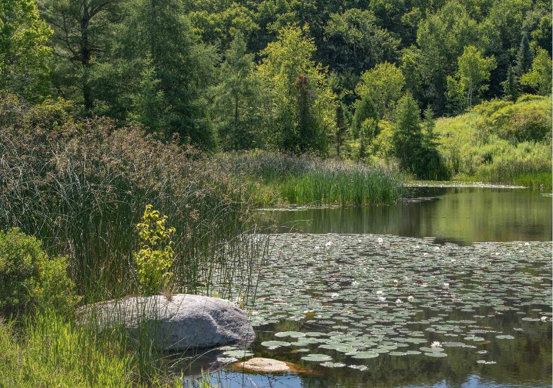 Native waterlilies sprawl in the shallow edges of a pond fringed with emergent plants.