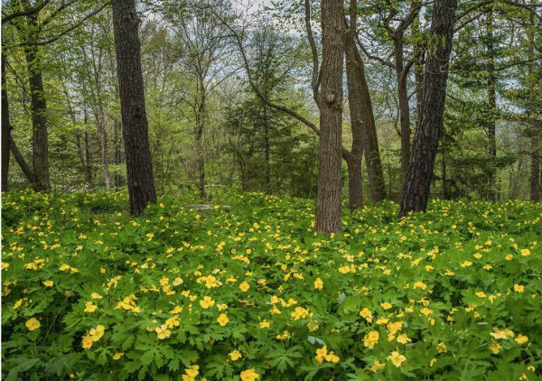 A woodland carpeted in spring with celandine poppies, Stylophorum diphyllum