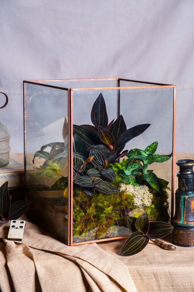 Terrariums are a nifty way to showcase orchids, such as these jewel orchids, grown for