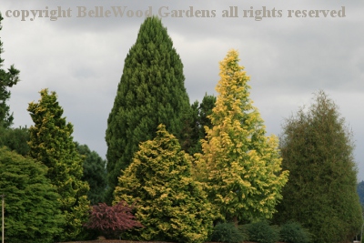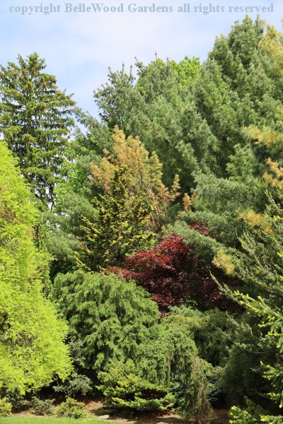 as this red leaf Japanese maple enhances a tapestry of conifers
