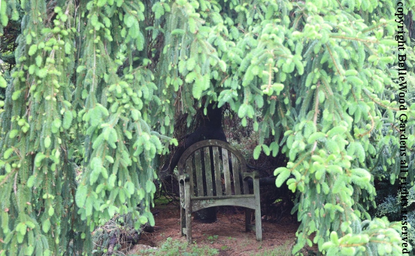 A weeping spruce forms a grotto, with a lichen covered chair tucked away.