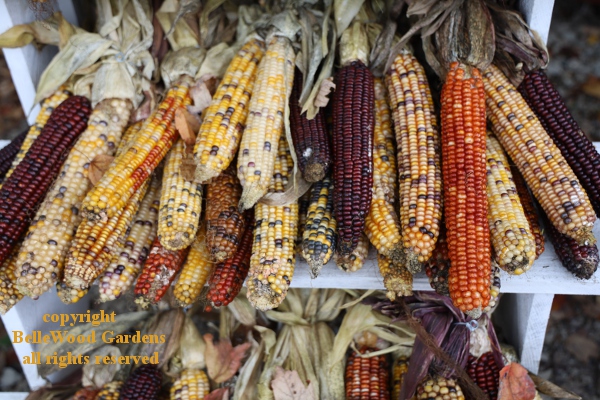 Colors of the seasons. Burgundy, scarlet, red, orange, yellow. Pumpkins. Indian corn.