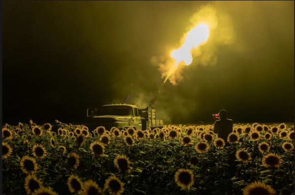 twin auto-cannon towards a Russian drone from a sunflower field, during an air attack near Pavlograd.