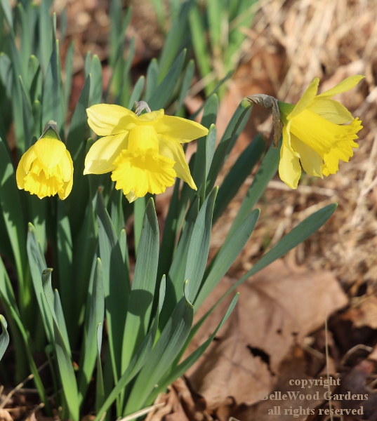 The welcome golden flowers of trumpet daffodils present their sunny flowers to welcome Spring.